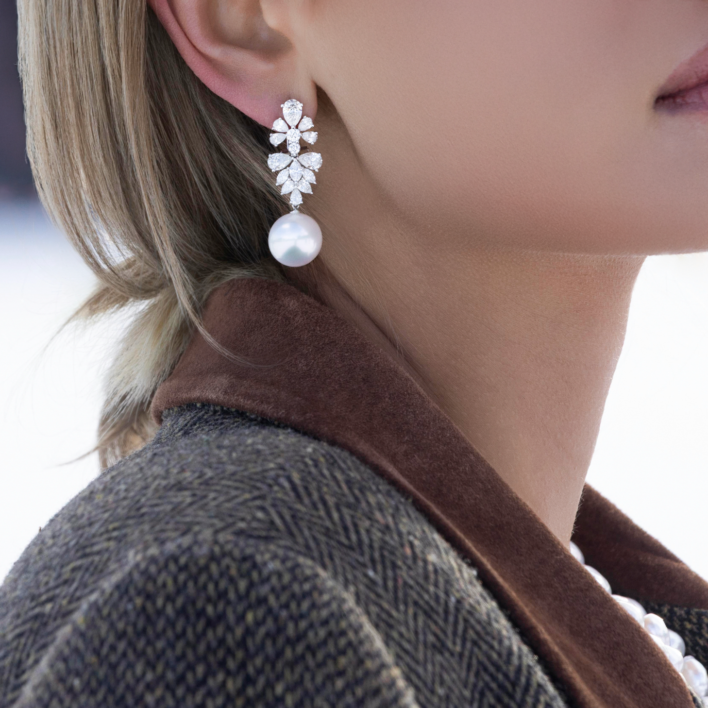 Elevate your collection with these Imperial Grace Drop Earrings, featuring lustrous 14-15mm white South Sea pearls paired with a striking diamond leaf design. Crafted in platinum and adorned with 7.07 carats of princess and marquis-cut diamonds, these limited-edition earrings deliver timeless sophistication and undeniable sparkle. A statement piece worthy of your most memorable moments.