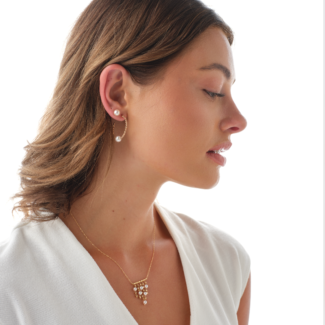 Get ready to shine with our Chandelier Sparkle Pendant! This gorgeous necklace features a stunning chandelier design in elegant gold, adorned with lustrous Akoya pearls. Complete the look with our matching earrings. Perfect for adding a touch of glamour to any outfit.