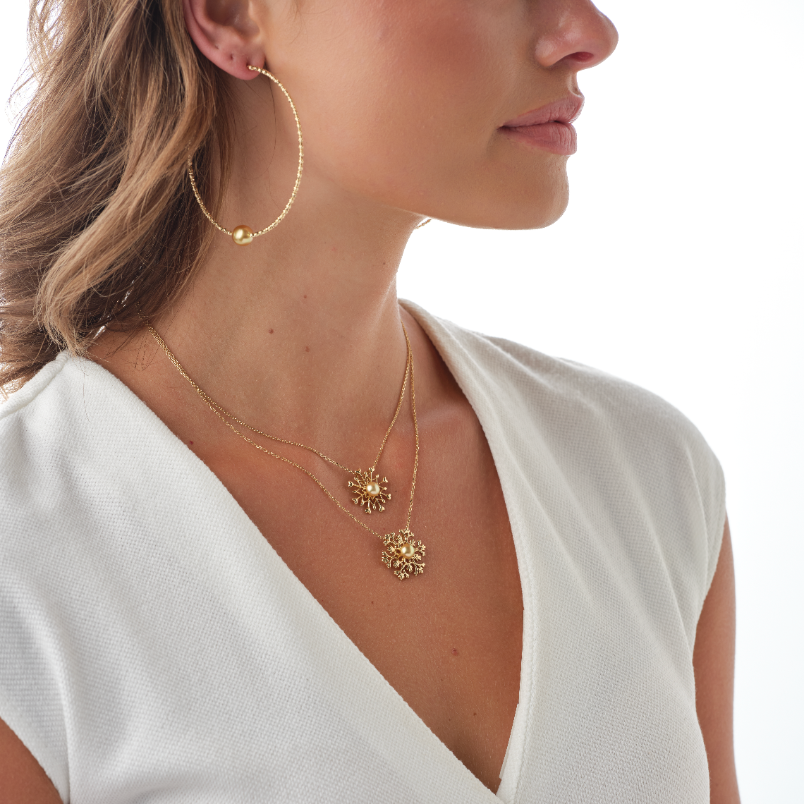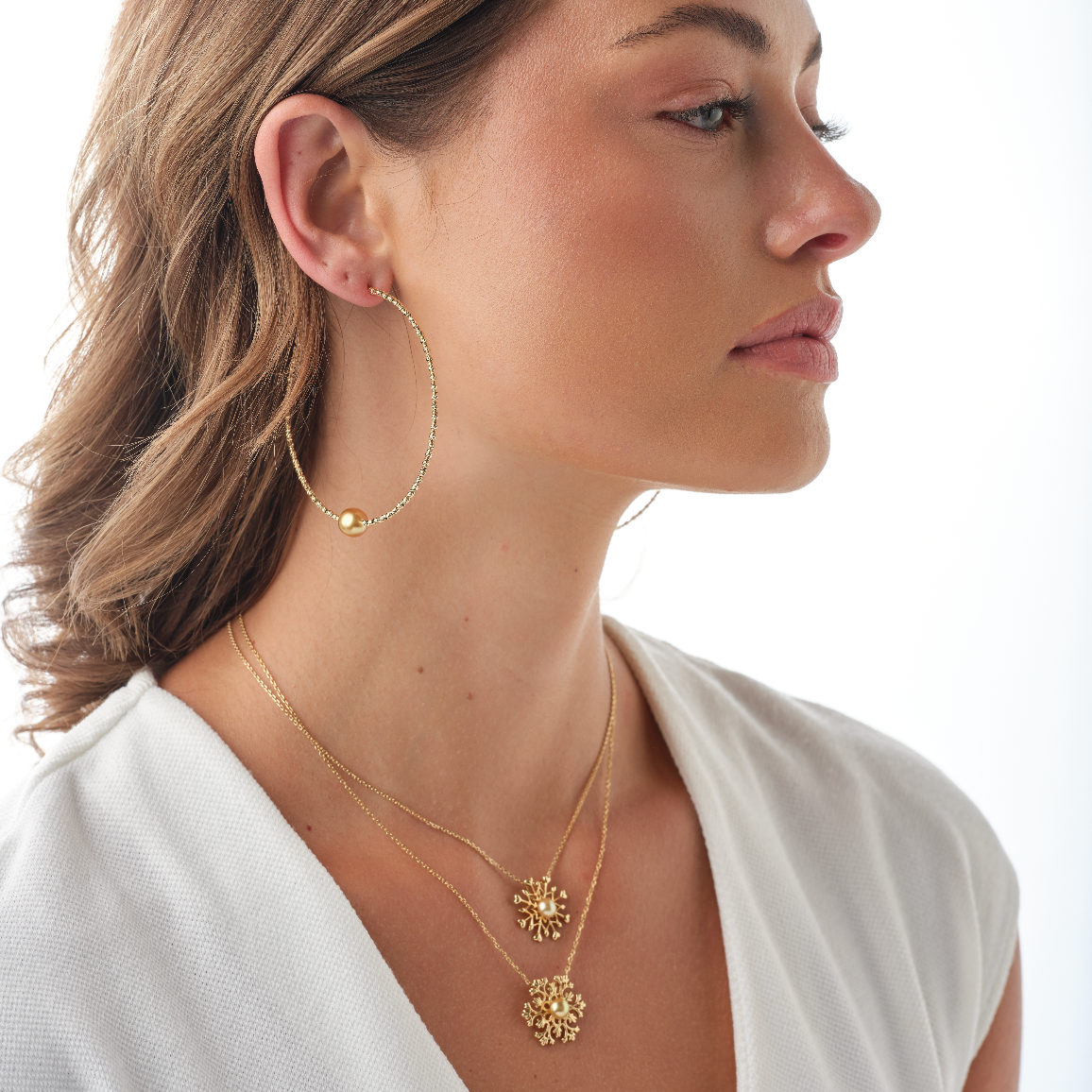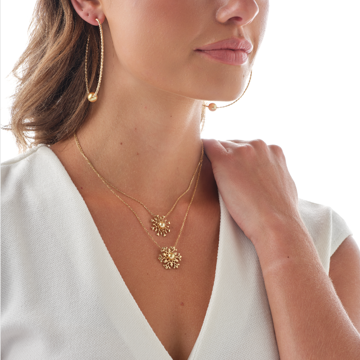 Capture the magic of winter's first snowfall with this exquisite South Sea Snowflake Pendant. Each piece showcases a distinctive snowflake design cradling a luminous golden South Sea pearl, masterfully set in warm yellow gold. A sophisticated celebration of the season's most enchanting moment, this pendant combines nature's artistry with timeless elegance, making it a treasured addition to any fine jewelry collection.