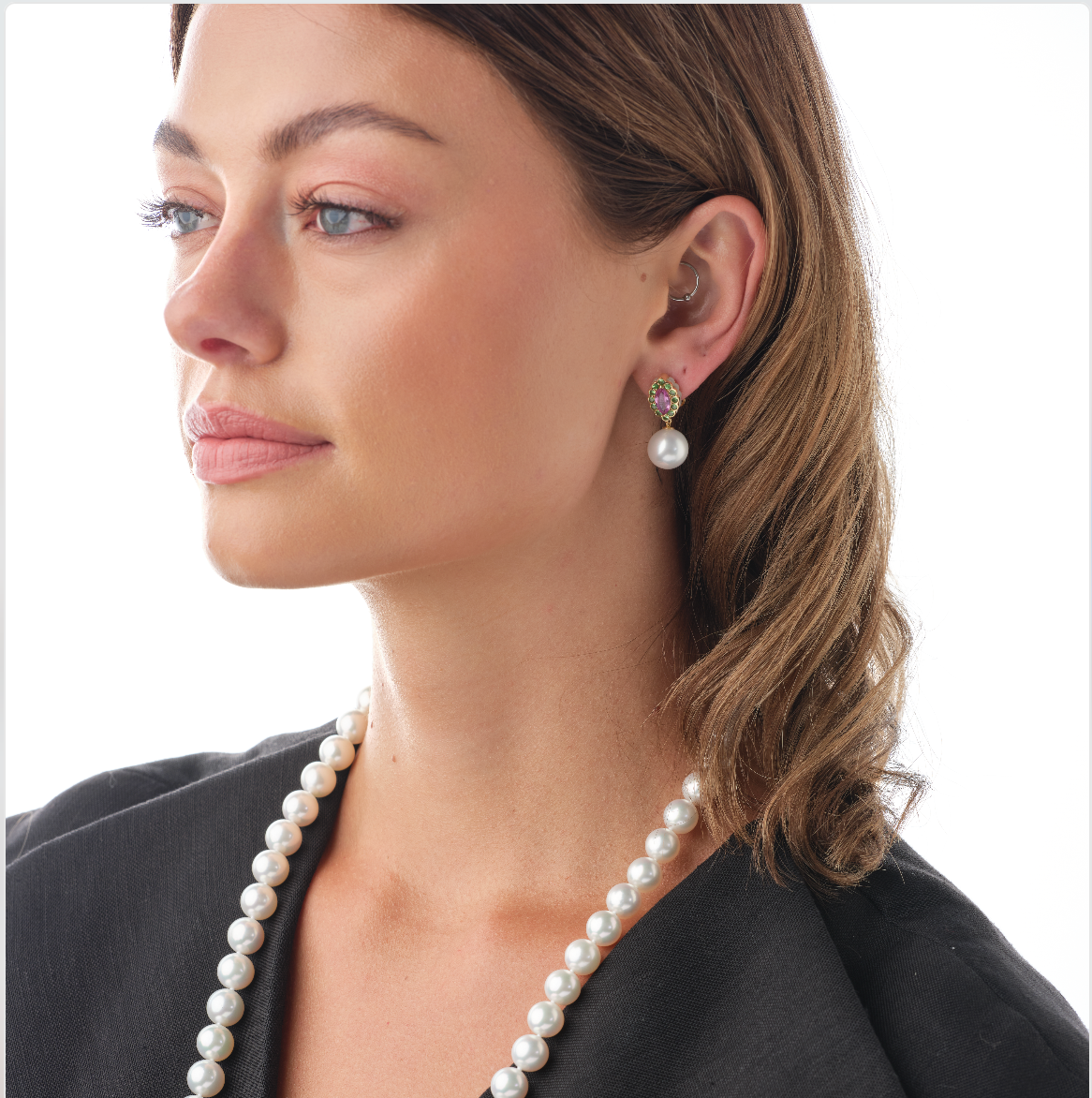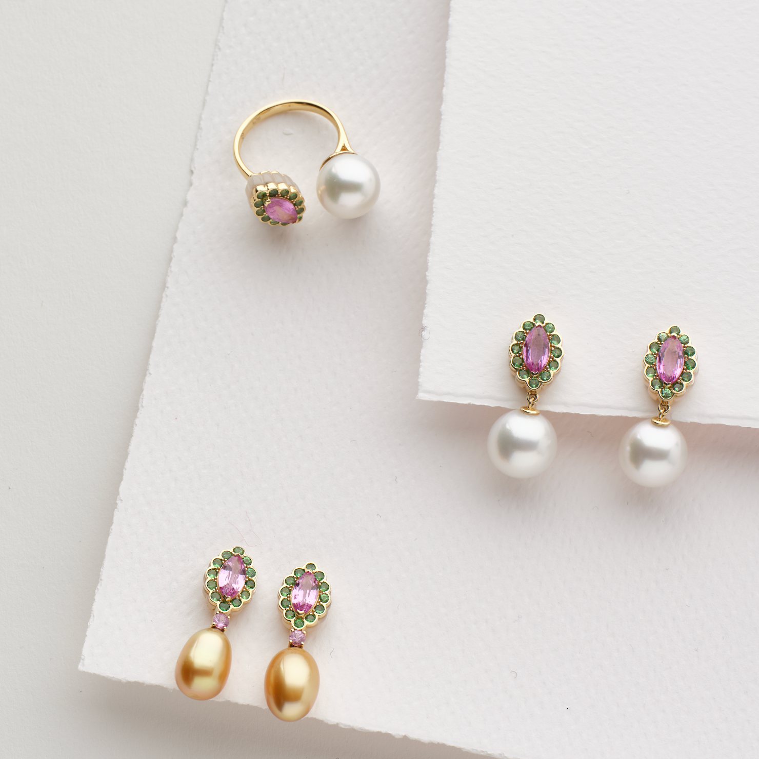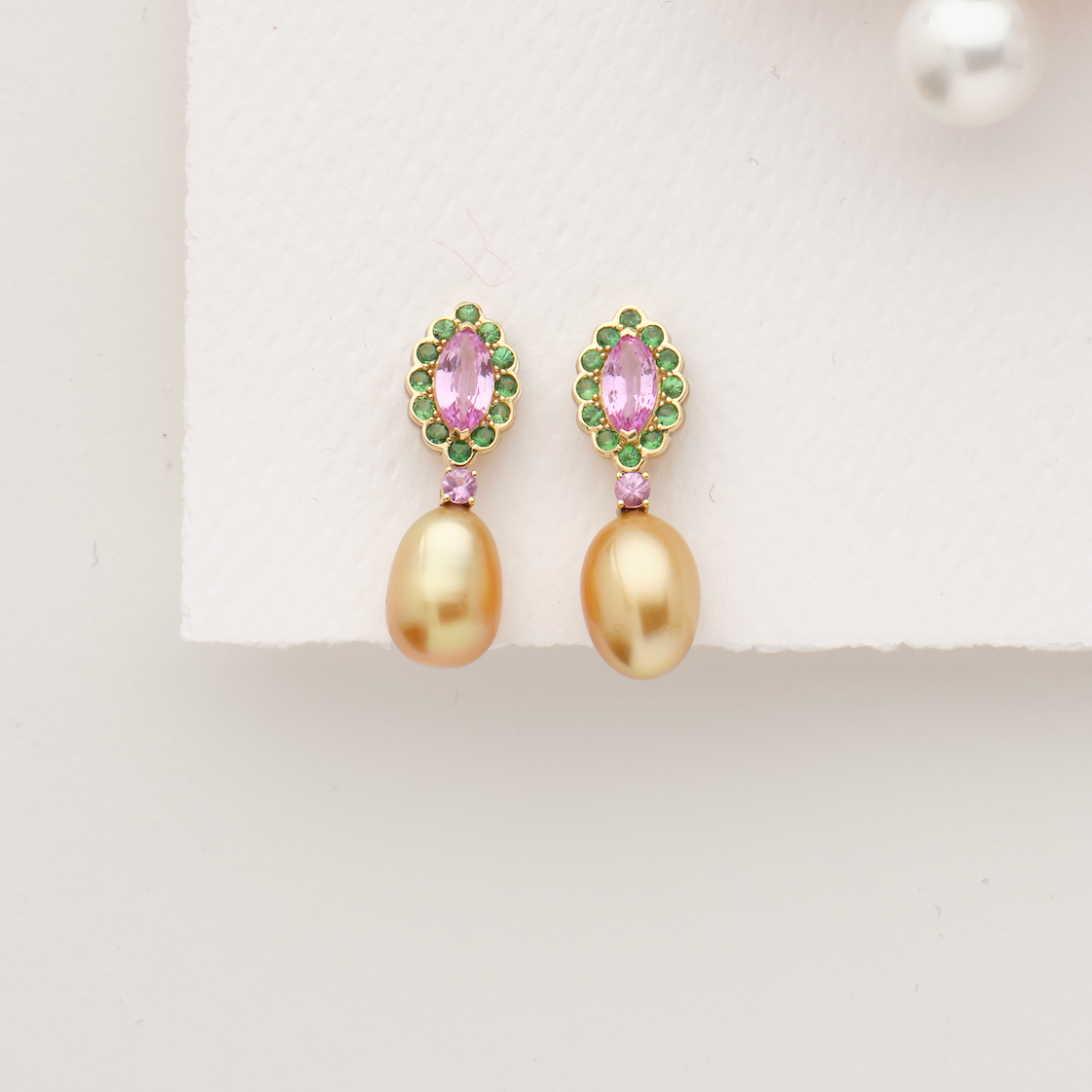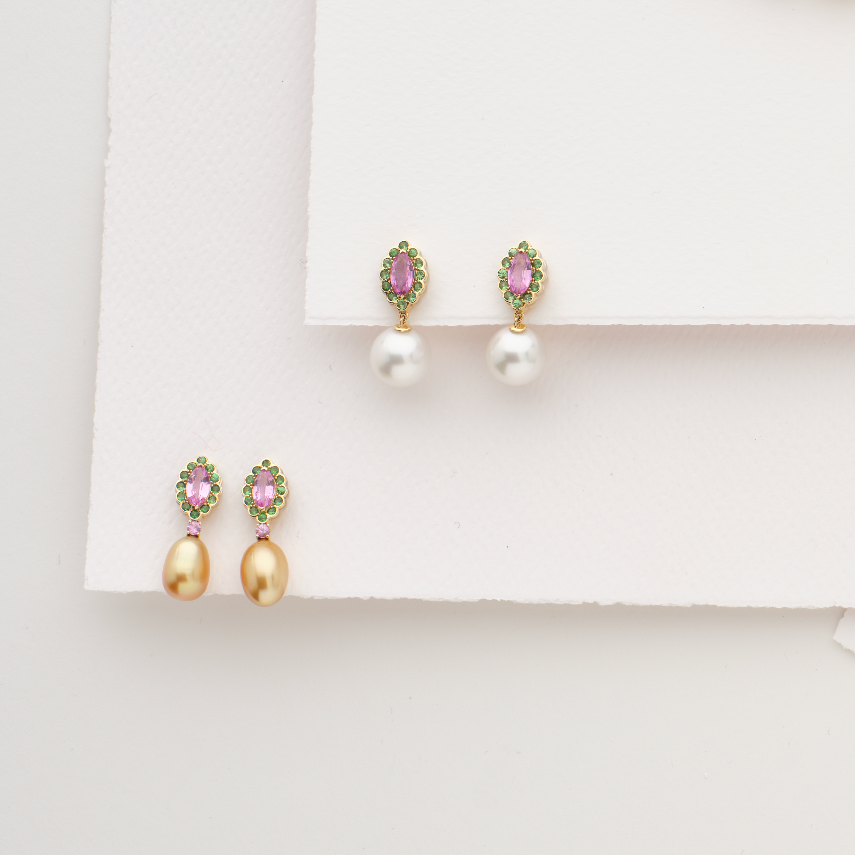 Radiant golden keshi pearls or South Sea White pearls meet vibrant pink sapphires and sparkling tsavorites in these sophisticated drop earrings. A harmonious blend of warmth and brilliance, they capture the essence of refined elegance with just the right touch of festive glamour. Perfect for elevating any occasion, these statement earrings command attention while maintaining an understated grace that speaks to discerning taste.