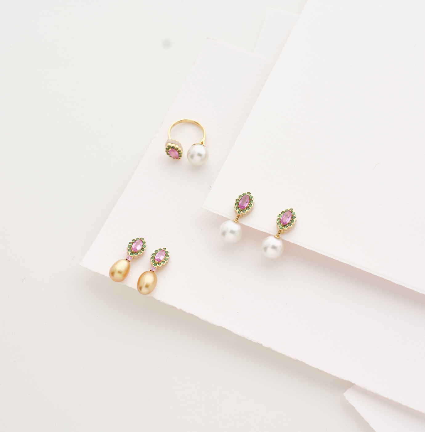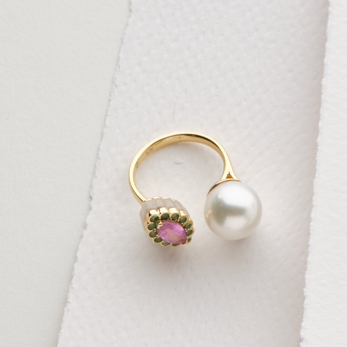 Radiant South Sea white pearls unite with vibrant pink sapphires and sparkling tsavorites in this sophisticated ring. The harmonious interplay of lustrous pearl, vivid gemstone hues, and brilliant sparkle creates a refined aesthetic that transcends occasion. Whether worn as an everyday statement piece or reserved for special moments, this ring delivers understated elegance with just enough festive glamour to captivate. A testament to discerning taste, it elevates any ensemble while maintaining the graceful restraint that defines true sophistication.