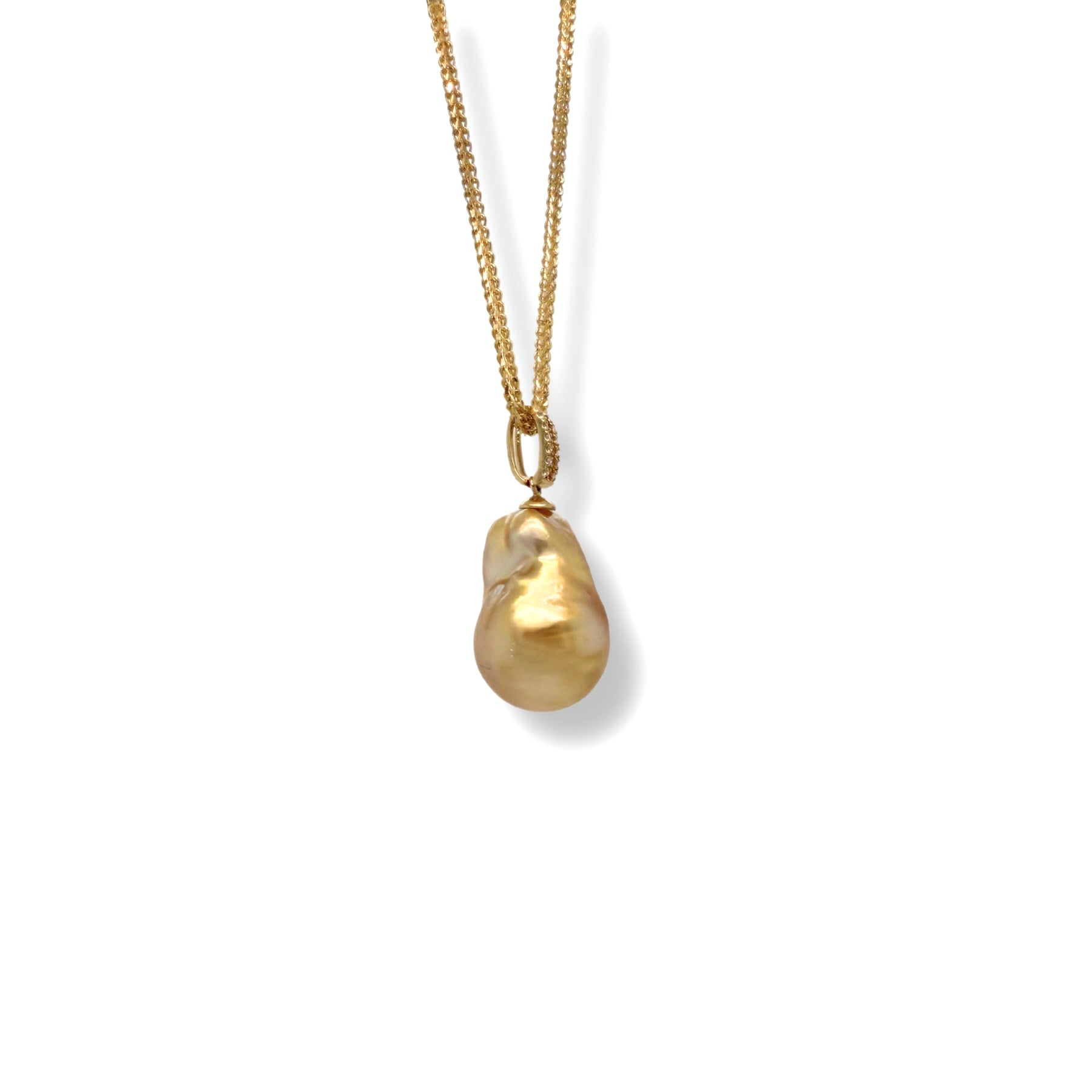 This versatile double chain necklace showcases a naturally lustrous golden baroque south sea pearl with distinctive character. Wear it long for an elegant layered look or short for a bold statement. Each pearl is unique, capturing the organic beauty of the ocean in a timeless piece that transitions effortlessly from day to evening.