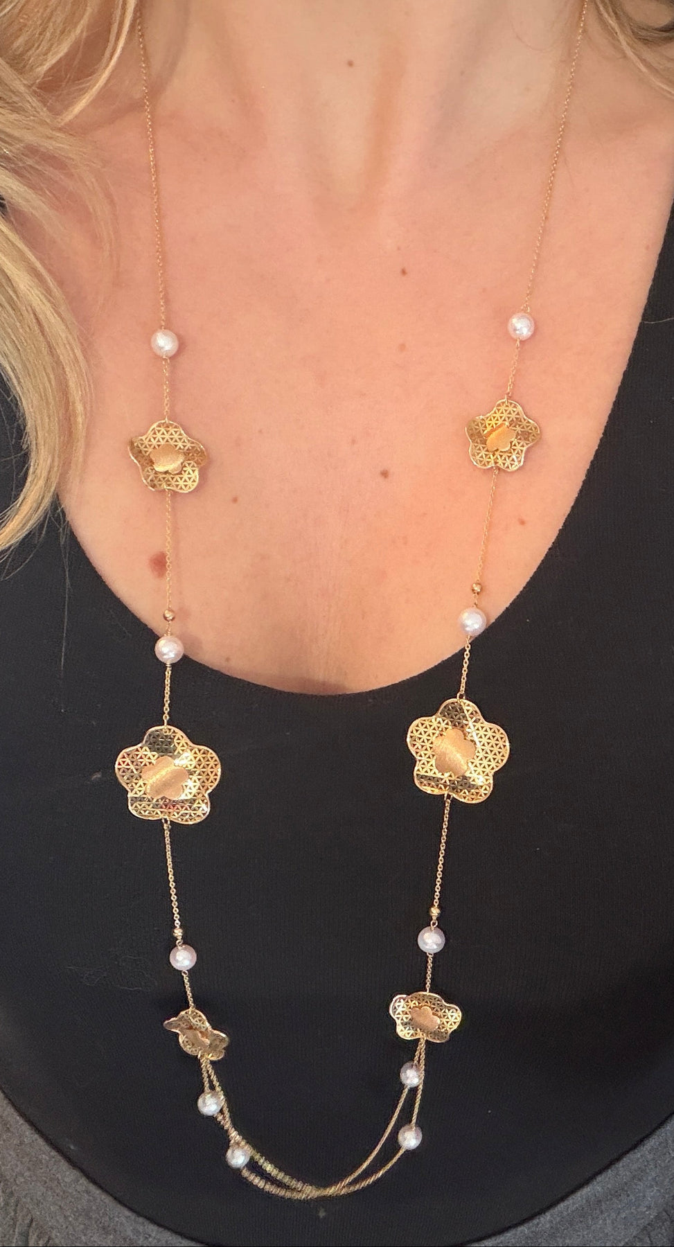 Delicate mesh flowers in yellow gold form the foundation of this stunning necklace, adorned with rose gold blooms and lustrous Akoya pearls that dance across the design. Inspired by timeless luxury aesthetics, this versatile piece transitions effortlessly from a layered look to an elegant long pendant—perfect for elevating any occasion with understated sophistication.