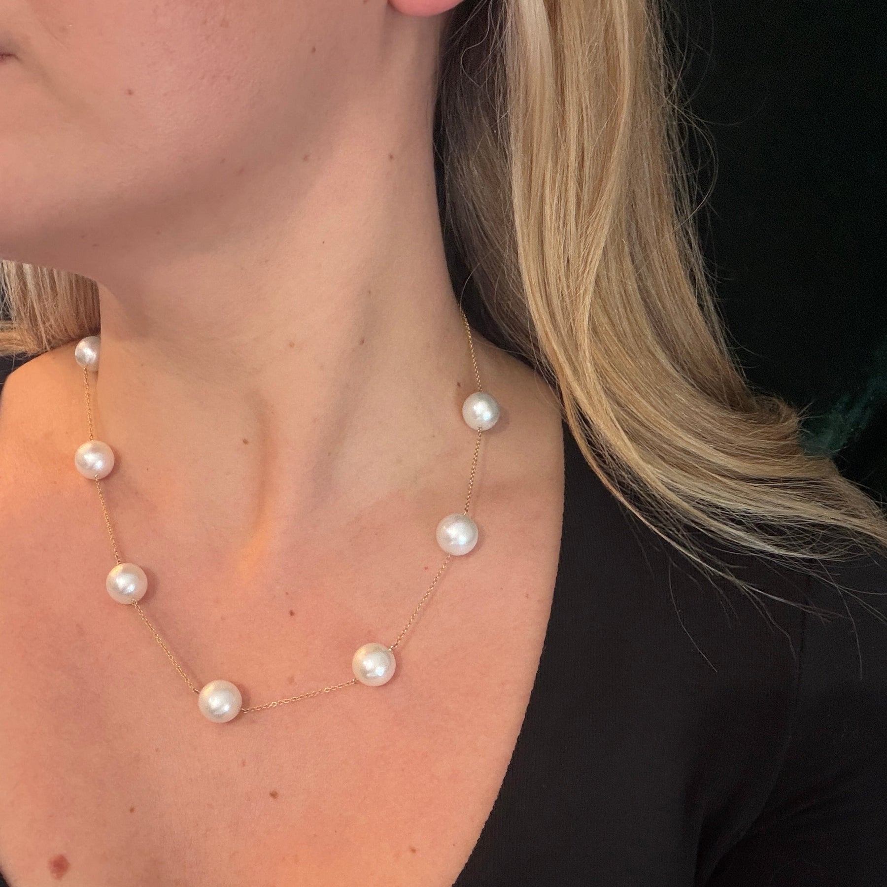 Elegant white South Sea pearls suspended along a delicate gold chain create an effortless floating effect. This timeless tin cup necklace combines classic pearl sophistication with modern minimalist design, perfect for everyday wear or special occasions.