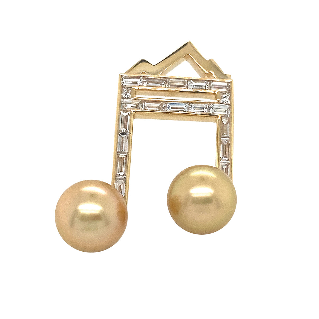 Music in the Mountains Custom Pin/Pendant: 8-8.5mm Akoya, Tahitian, or Golden South Sea Pearls in 18K White or Yellow Gold with Diamond Baguettes.