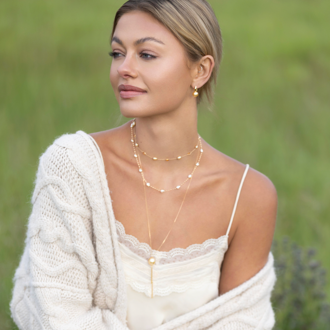 The Sparkle Golden Keshi Necklace is a stunning piece that will elevate any outfit. Featuring eleven South Sea Gold Keshi Pearls on our signature sparkle faceted gold chain, this necklace is perfect for adding a touch of elegance to everyday looks or for layering with other pieces. Don't miss out on this must-have accessory!