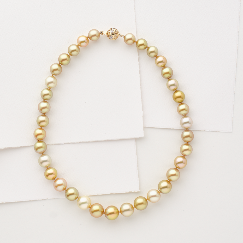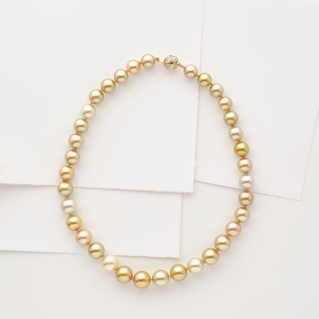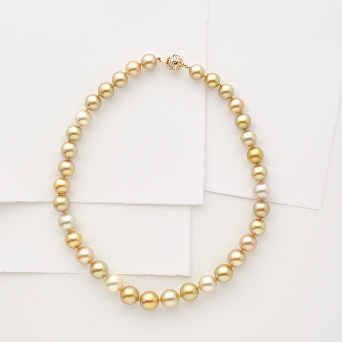 Discover the Golden Symphony Strand, a rare collection of South Sea pearls unified in luminous harmony. This exquisite strand showcases a captivating palette of deep honey, pale gold, and rich metallic tones that dance across each pearl's surface. Each gem has been carefully selected to create a sophisticated composition that transcends ordinary jewelry. Designed for those who appreciate refined elegance, this strand makes a graceful statement whether worn as a timeless classic or a contemporary accent piece.