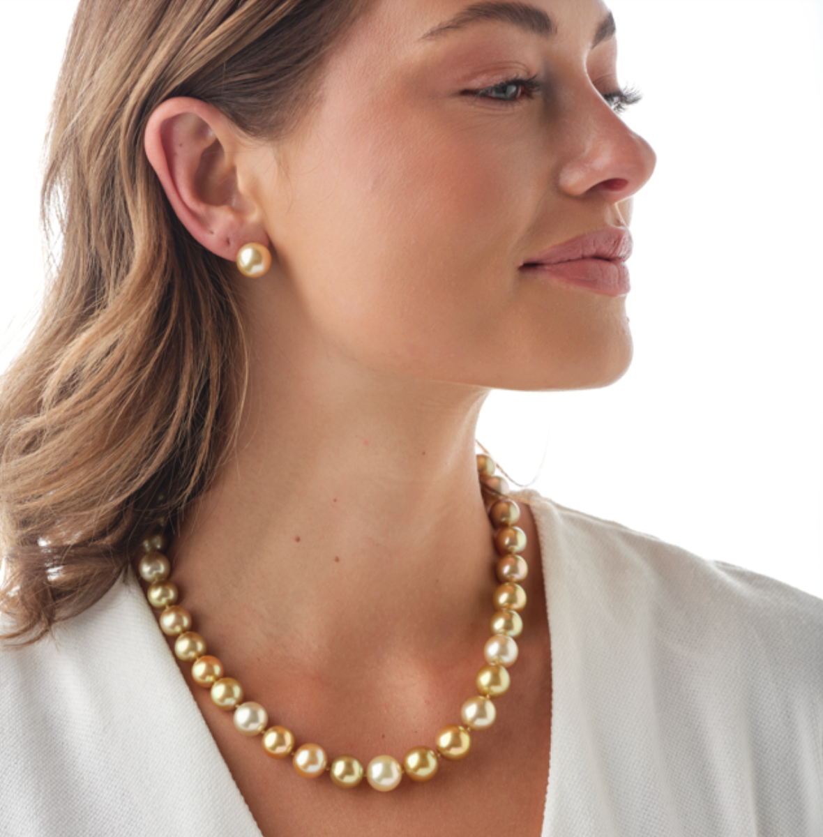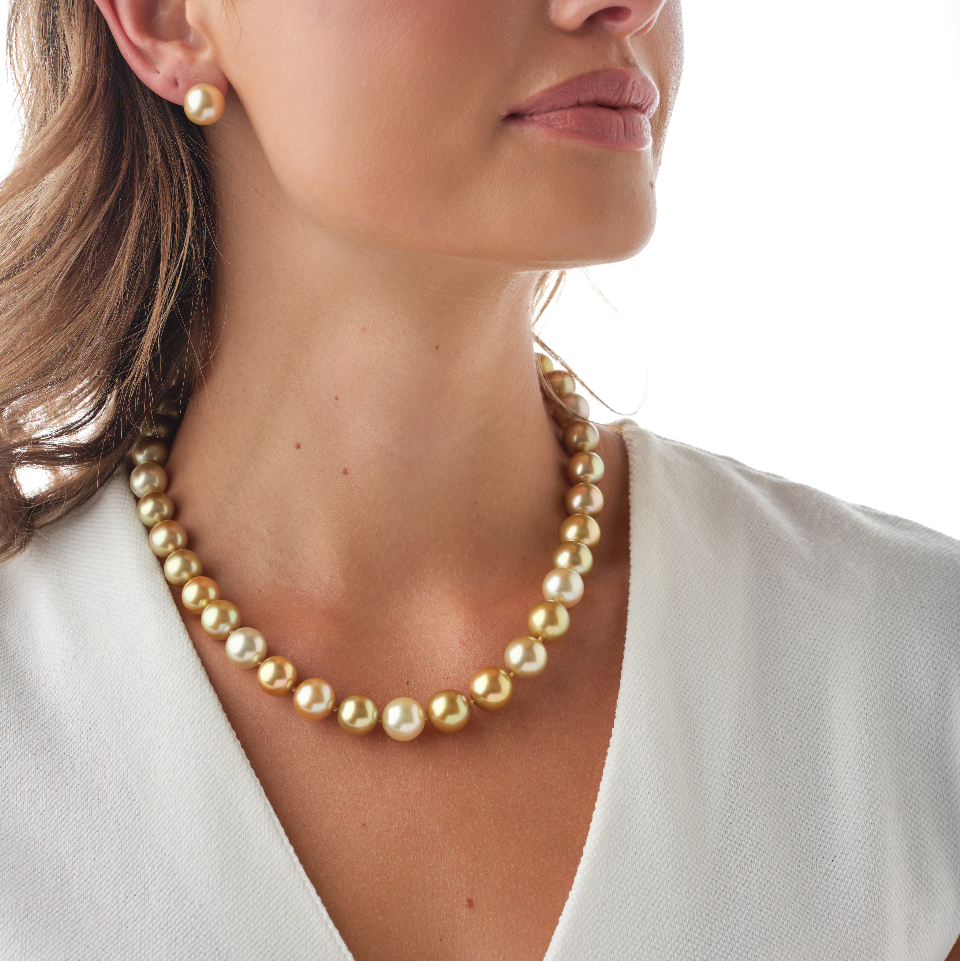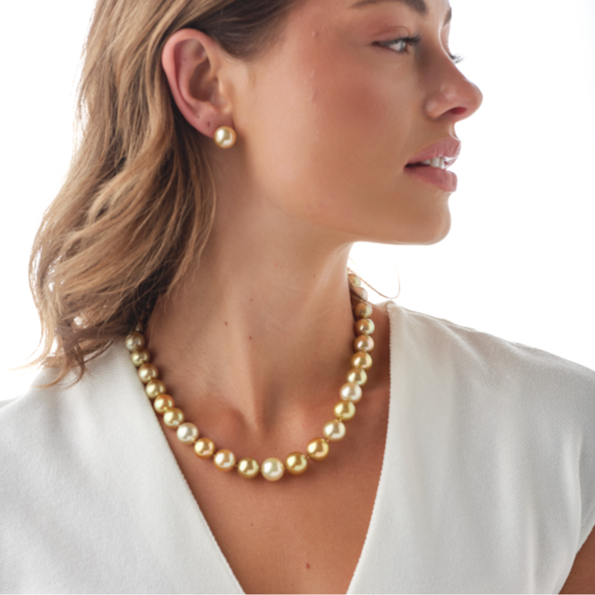 Discover the Golden Symphony Strand, a rare collection of South Sea pearls unified in luminous harmony. This exquisite strand showcases a captivating palette of deep honey, pale gold, and rich metallic tones that dance across each pearl's surface. Each gem has been carefully selected to create a sophisticated composition that transcends ordinary jewelry. Designed for those who appreciate refined elegance, this strand makes a graceful statement whether worn as a timeless classic or a contemporary accent piece.