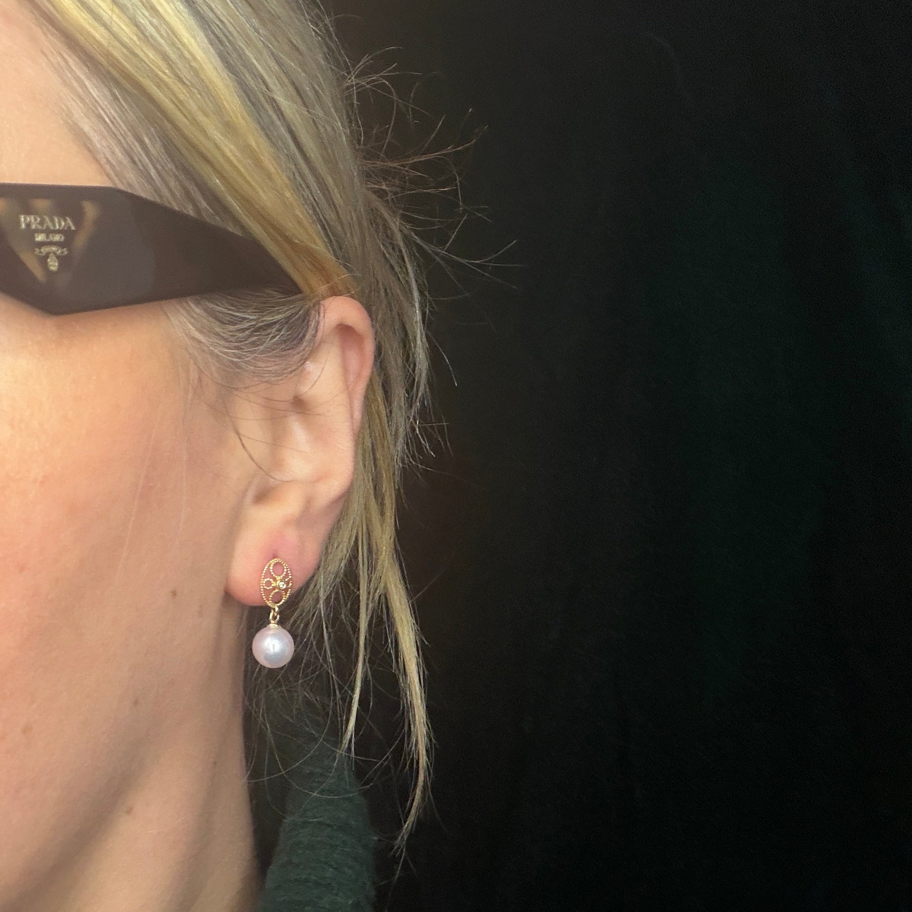 Elegant Akoya pearl drop earrings featuring intricate oval-circular gold filigree in 18K yellow gold, each accented with a single sparkling diamond.