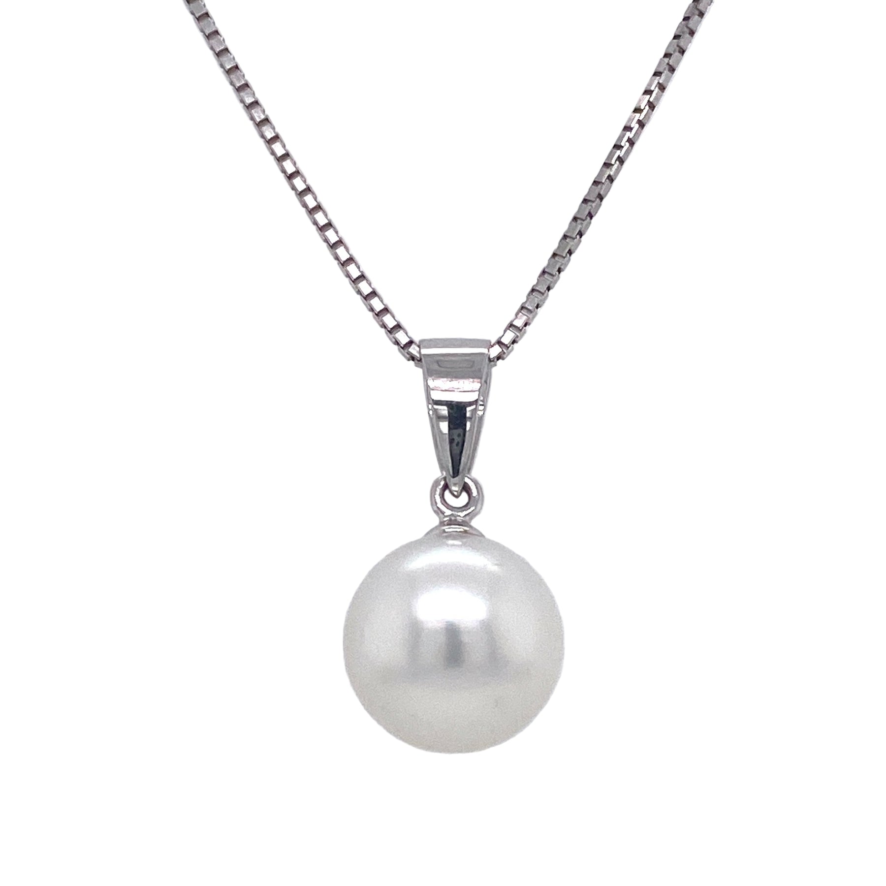 A timeless white gold pendant showcasing a single luminous white South Sea pearl. This elegant solitaire design celebrates understated sophistication, letting the pearl's natural beauty take center stage. Perfect for everyday wear or special occasions, it's a versatile piece that complements any wardrobe with refined simplicity.